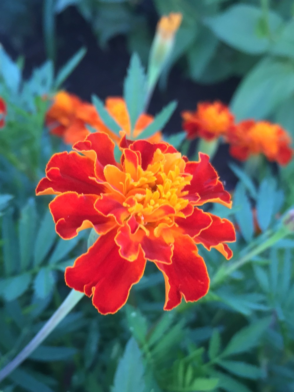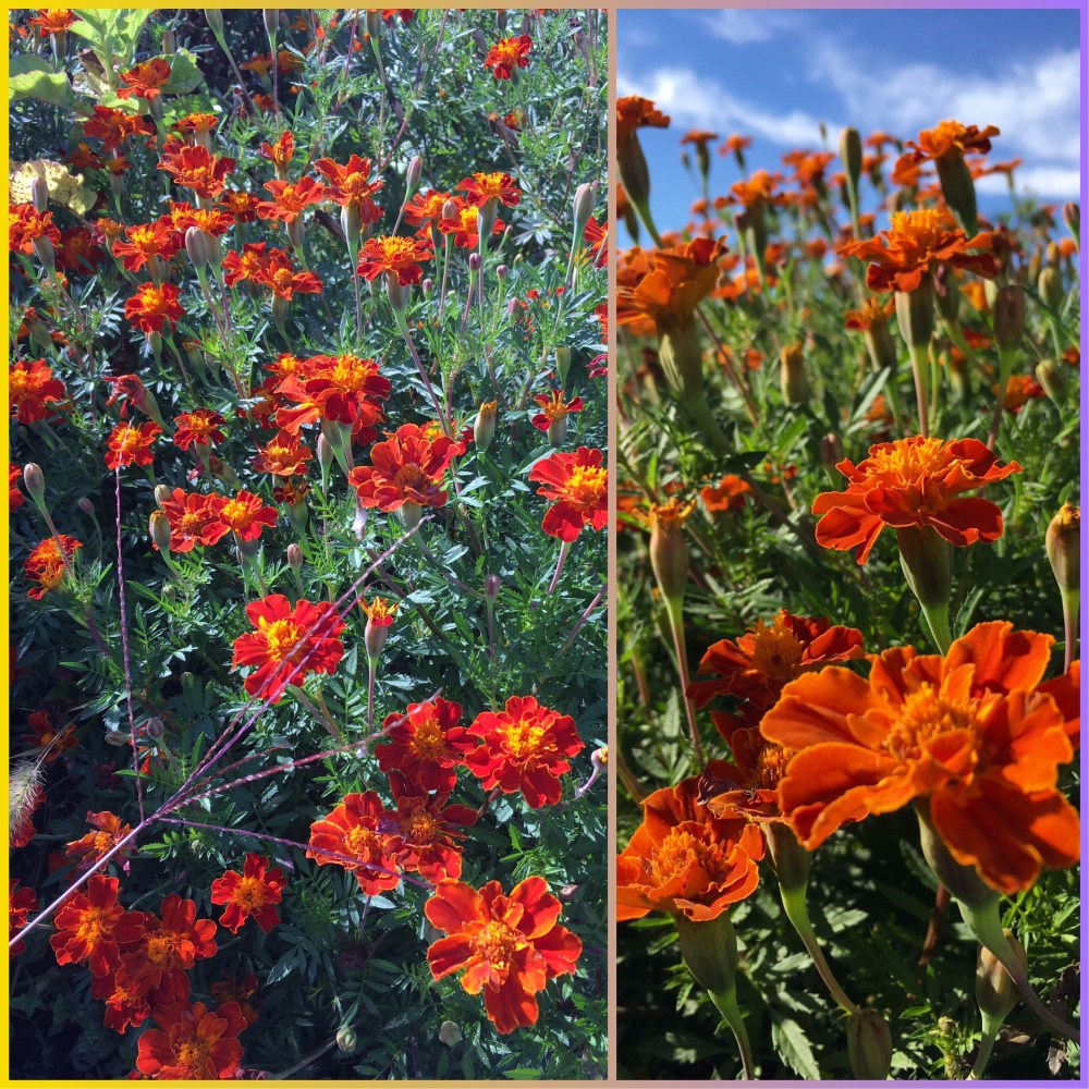 Marigold is a good insect and pest repellent plant. We grew it as a companion plant for our collard and cabbage plants. These red and orange bright marigold flowers added colors and unique beauty into our vegetable patch.