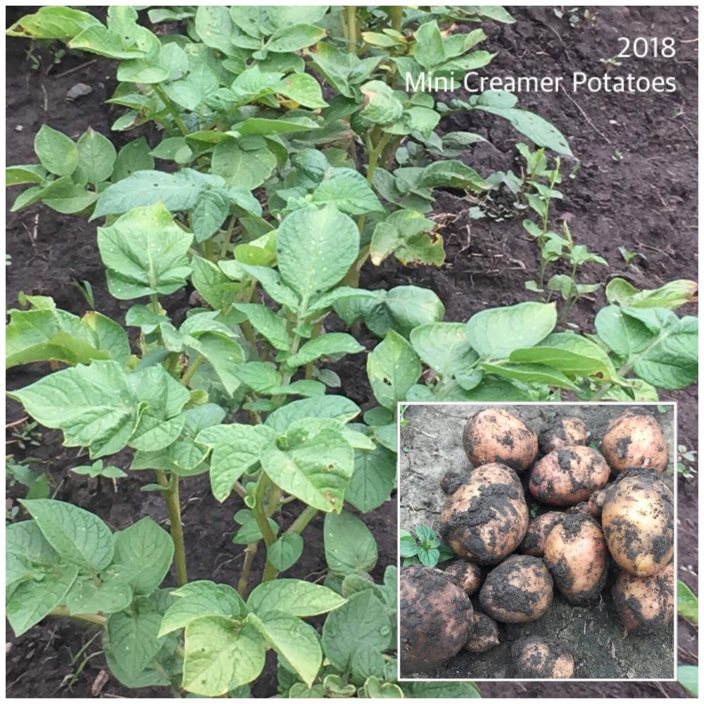 In 2017 we grew fingerling potatoes, and in 2018 we grew mini creamer potatoes. Each year, roughly two months before the growing season, we bought a bag of potatoes from the supermarket and let them sprout. Then whole potatoes were planted in the bed and hill up them with the growth of the plants. They need even watering and well-drained soil. After three months, plants started to die, and it was the indication to dig the ground to harvest potatoes. According to my experiences, homegrown fresh potatoes are rich in flavor than the ones in the supermarkets.