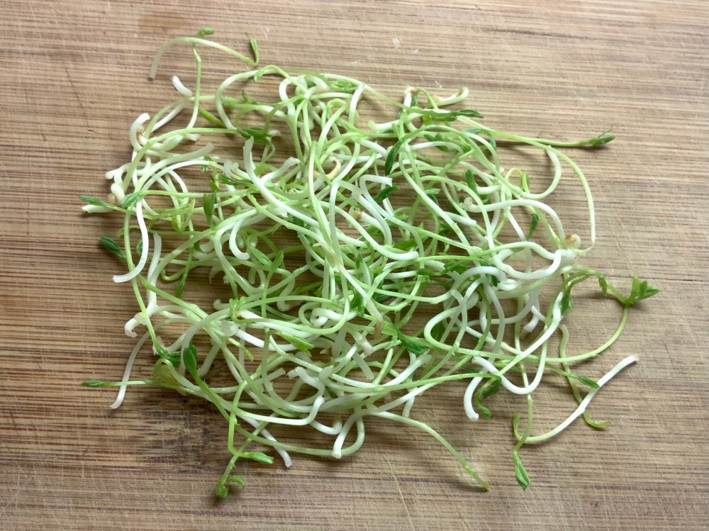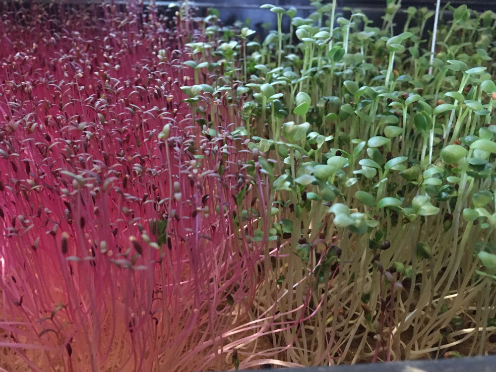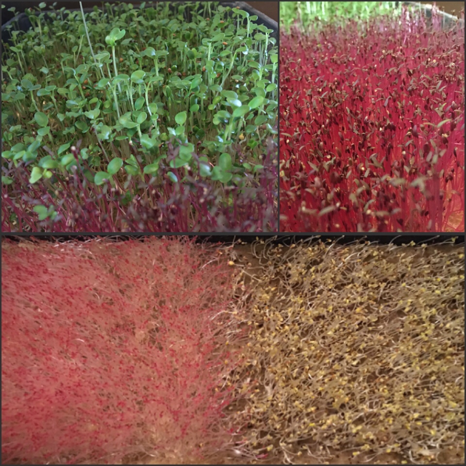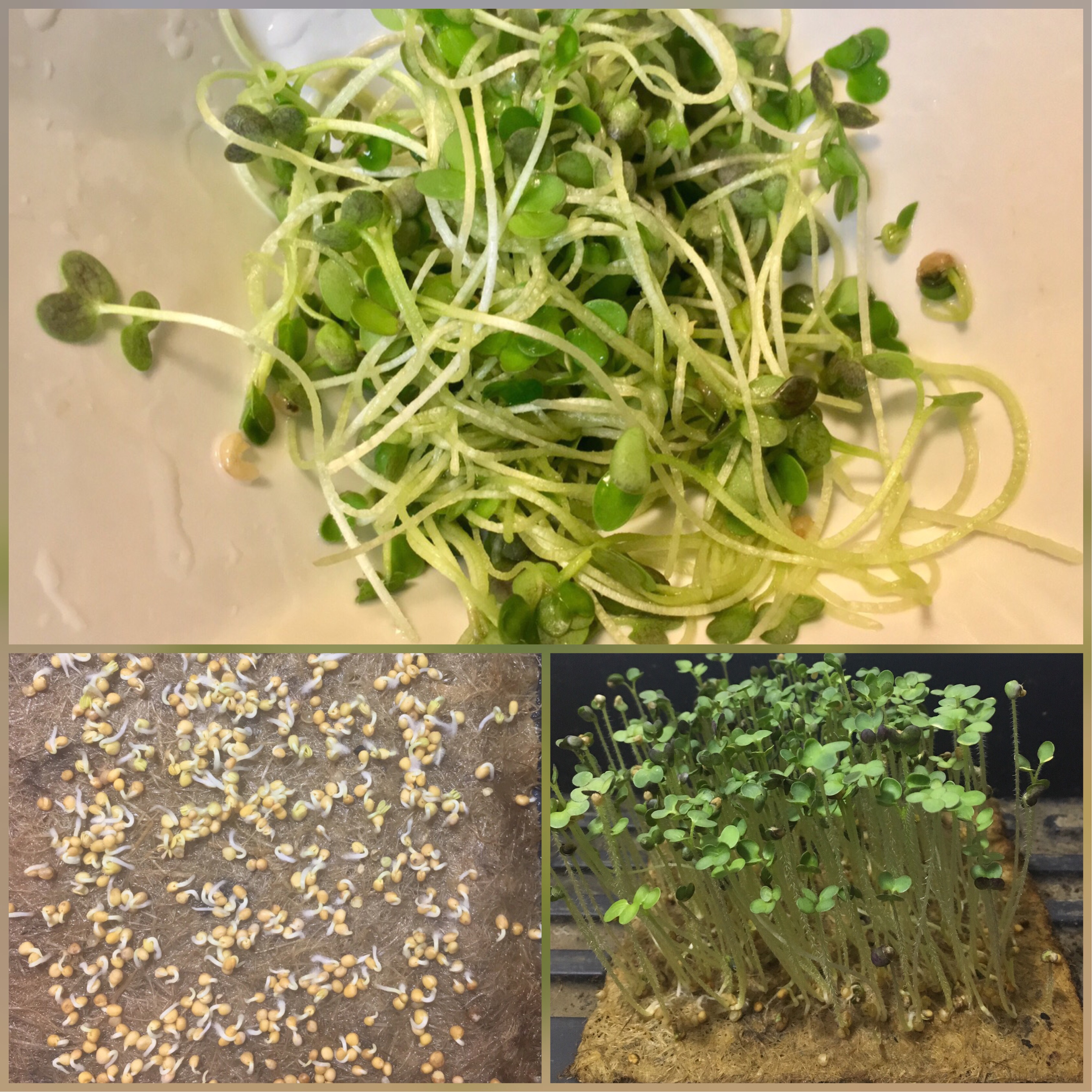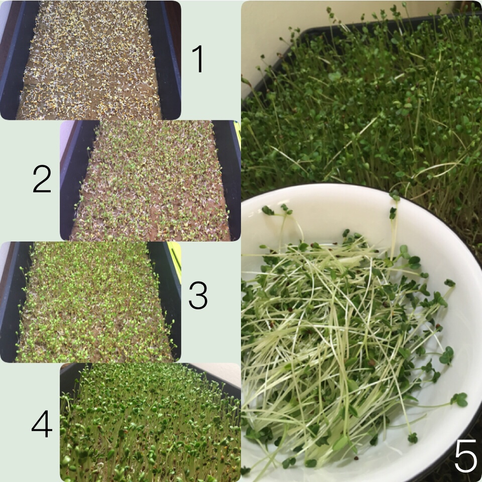 First we dip the grow mats with water, and then sprinkle the seeds evenly on it. They usually take two days to germinate, so we have to keep them in the dark for the first two days. Then we can transfer them near an artificial light source or a window (you do not necessarily need grow lights for microgreens). We keep them under our living room light. We spray water every other day to keep them moist. After five days we can harvest broccoli, clover, red radish, alfalfa and mustard sprouts for salads. But lentils need four or five more days to make sprouts. We can add lentil sprouts into soups or to curries to intensify their flavor.