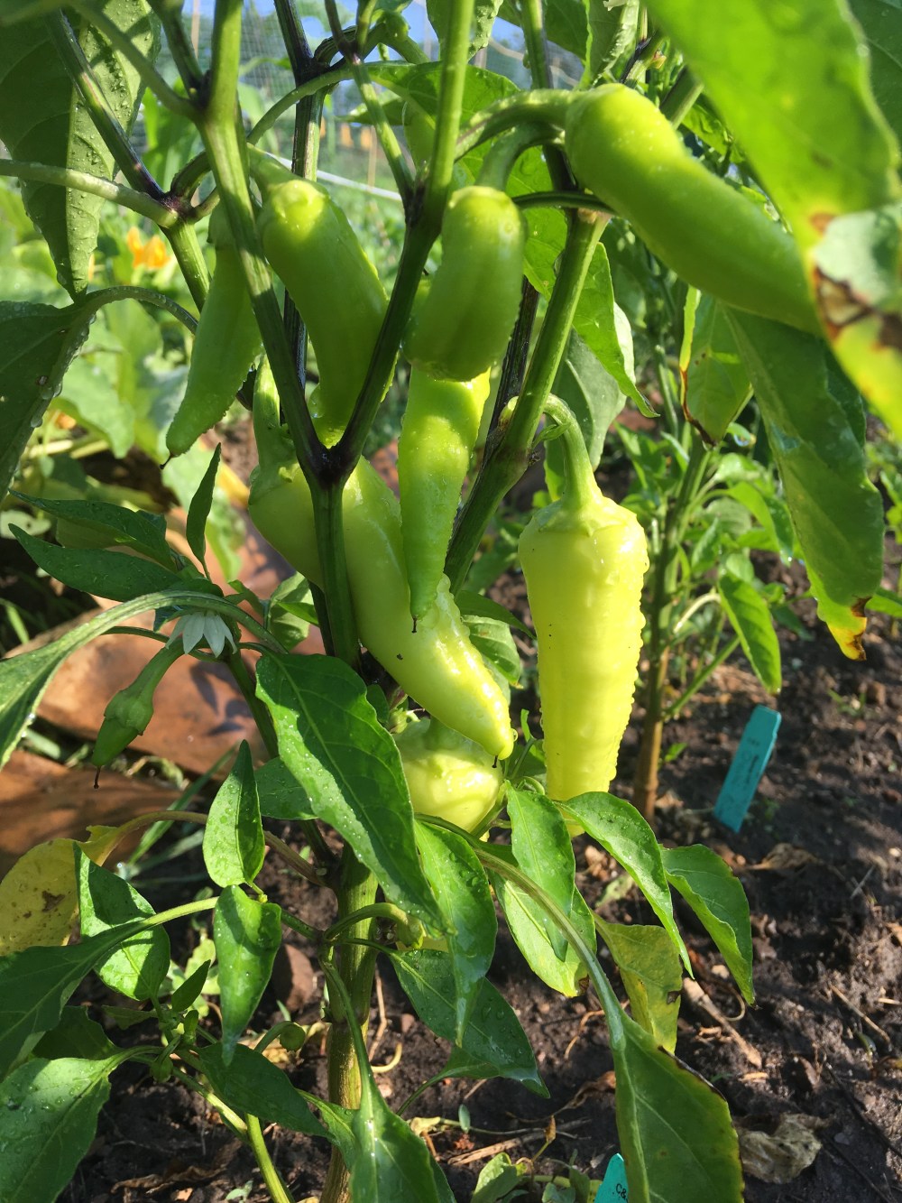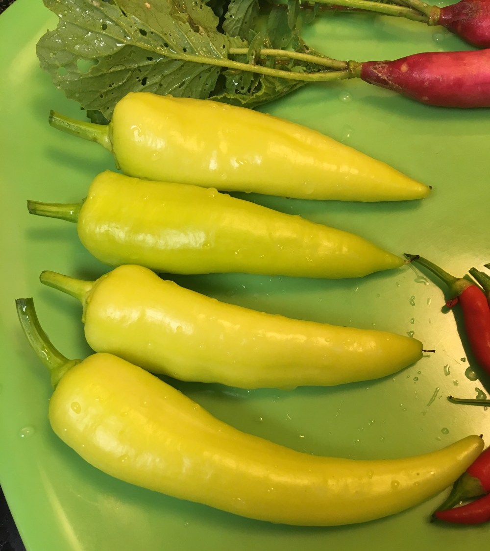 For the very first time, we grew banana peppers this year. We bought two plants from the OSU annual plant sale and planted them on our pepper bed in mid-May. We fed the plants with NPK organic fertilizers, added eggshells to prevents slugs, and used neem oil to control fungus diseases. After one and a half months, we were able to pick our first banana pepper harvest.