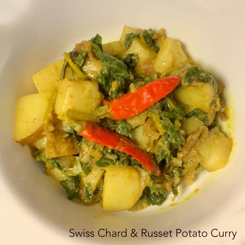 Swiss Chard Curry Posted by kitygardener on July 17, 2019July 17, 2019 Swiss Chard & Russet Potato Curry Ingredients: Homegrown Swiss Chard,Russet Potato & Red Chili Onion, Salt, Turmeric, Curry powder, Olive oil, Almond milk **** Share this: Click to share on X (Opens in new window) X Click to share on Facebook (Opens in new window) Facebook Like Loading... Related