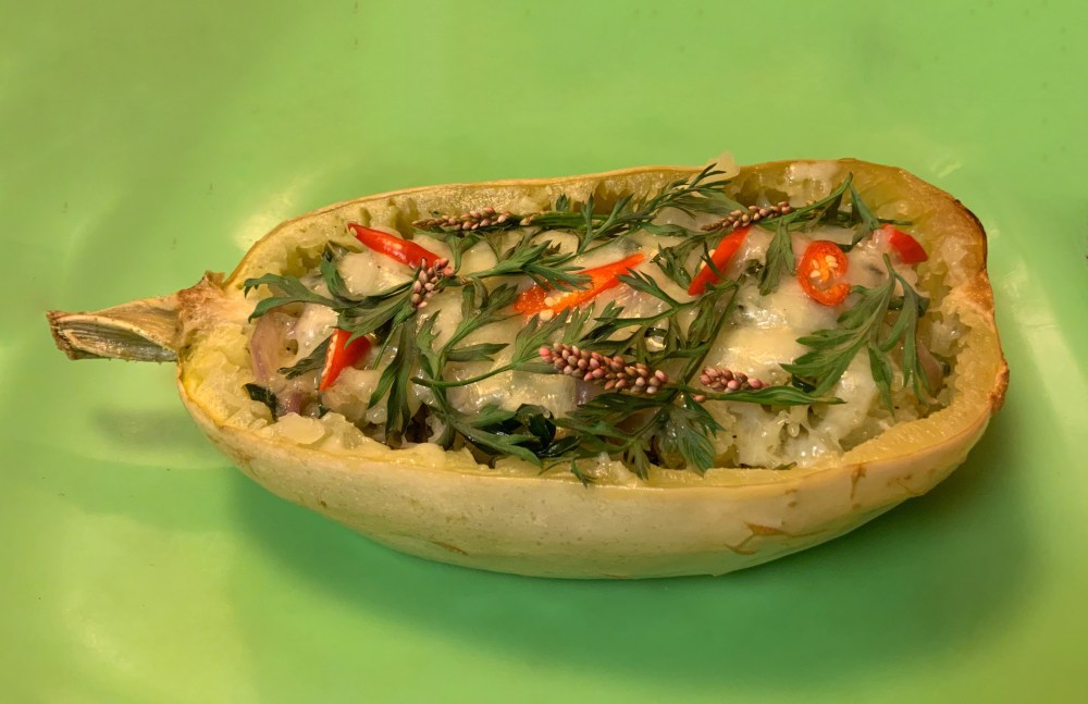 Stuffed Spaghetti Squash Posted by kitygardener on July 20, 2019 Ingredients: Baked spaghetti squash (375F – 40 minutes), Lady’s thumb leaves and flowers, Carrot leaves, Red chili, Onion, Salt, Black pepper, garlic powder, Cheese **** Share this: Click to share on X (Opens in new window) X Click to share on Facebook (Opens in new window) Facebook Like Loading... Related