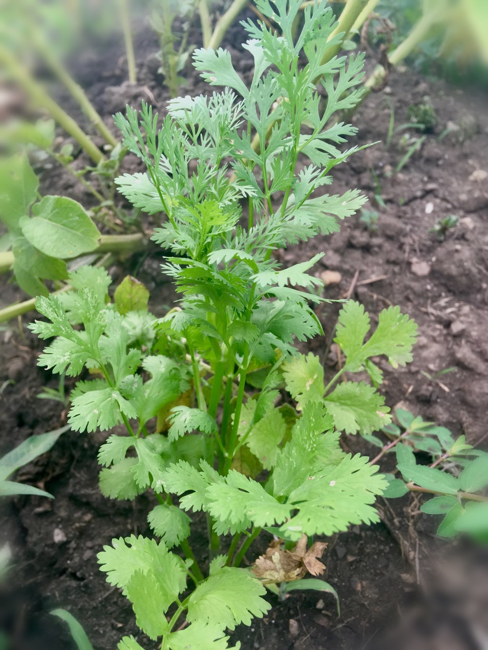 Some coriander plants voluntarily grew in our potato bed. Later they bloomed(tiny white flowers) and bore cute little coriander seeds. When they matured and dried, we collected them and made healthy herbal tea.