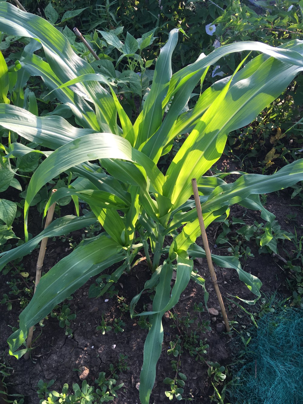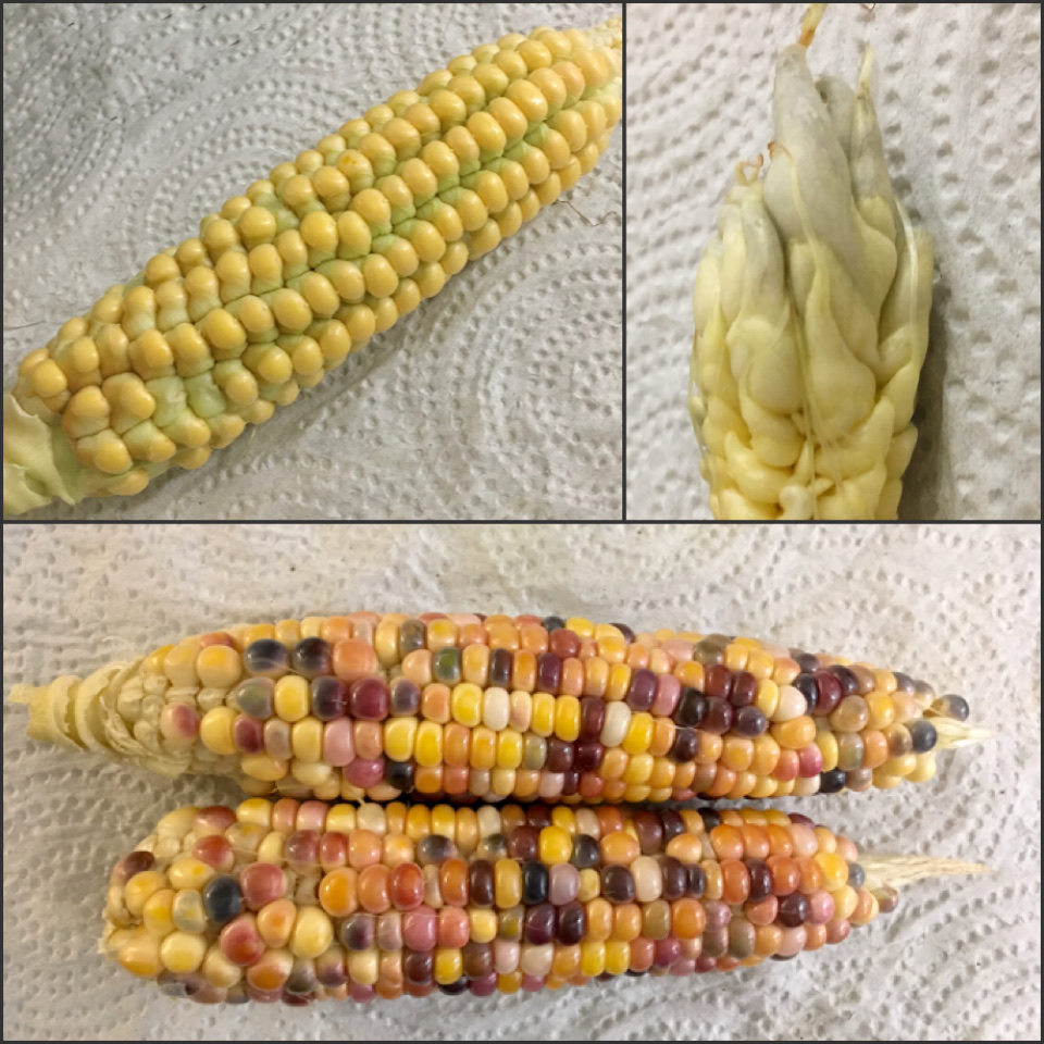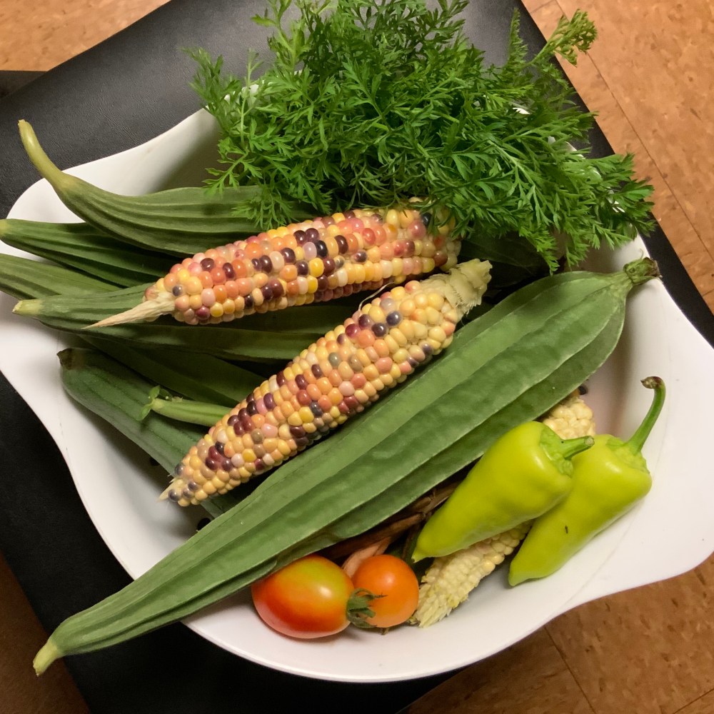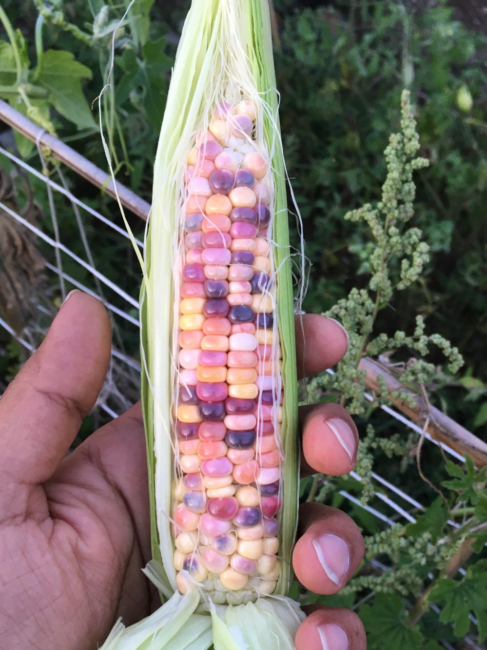 This summer, we grew three varieties of corn; Glass-gem Corn, Sweet Corn, and Dent Corn. We used our seeds saved from last year’s harvest to grow sweet corn. We grew corn together with squash and bean varieties using the Native American three-sister technique. Bean plants provide nitrogen for corn and corn helps them to climb, while squash plants cover the soil and keep it moist. At first, we had to cover our corn bed until corn seedlings were 4-5 inches tall using a bird-net because crows and blackbirds love to eat corn seeds. We harvested most of our sweet corn and dent corn as baby-corn. We happily shared more than half of our harvest with squirrels, raccoons, and deer.