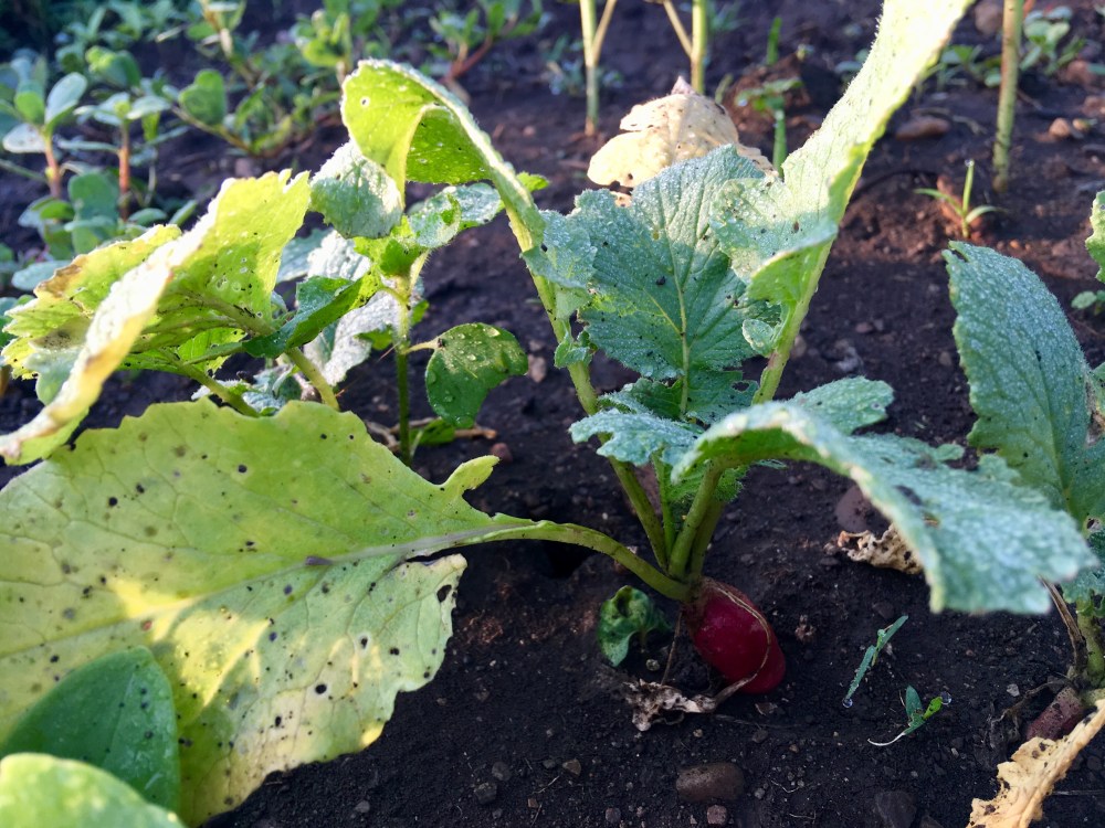This year we grew two varieties of radish; French Breakfast and Cherry Belle. We added gelatin into the ground before planting seeds as it is a good source of nitrogen. Four or five weeks after seeding, we can harvest radish. Usually, they love cold weather, so spring and fall are the best seasons to grow them. During the hot summer, they bloom quickly and get a strong peppery taste.