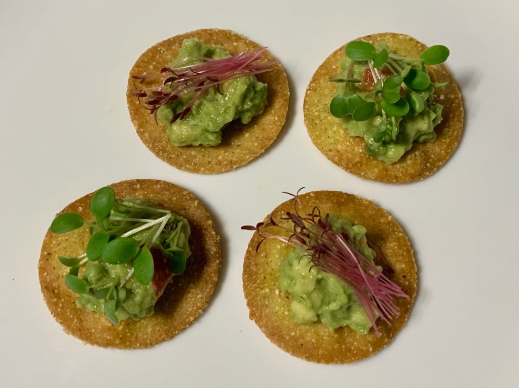 Microgreens, Wood sorrel, Roasted corn, Cheese, Yogurt, Guacamole